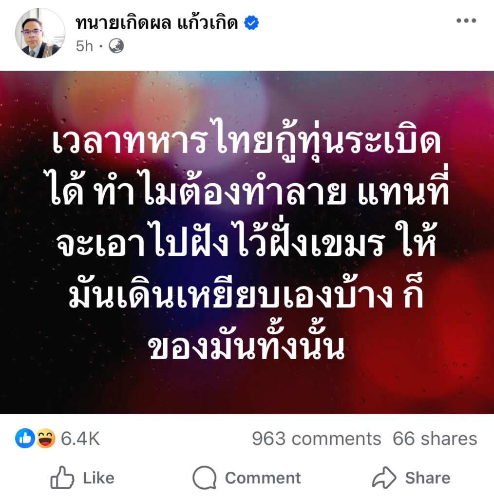 ทนายเกิดผล เสนอ! เอาทุ่นระเบิดที่ทหารไทยกู้ได้ไปฝั่งเขมร ของมัน ให้มันเดินเหยียบเอง