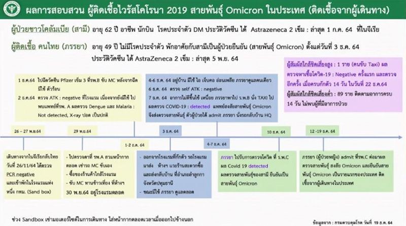 นพ.จักรรัฐ กล่าวว่า สำหรับผู้ป่วยติดเชื้อโอไมครอน รายแรกชายอเมริกัน 35 ปี รักษาหายแล้ว ส่วนรายที่พบว่าเป็นการติดเชื้อในประเทศ แต่เป็นการติดเชื้อจากผู้ที่เดินทางมาจากต่างประเทศ คือ นักบินชาวโคลอมเบีย อายุ 62 ปี มีโรคประจำตัวเบาหวาน รับวัคซีน AZ 2 เข็ม เดินทางมาจากไนจีเรีย และเข้าระบบ Sandbox เข้าไทยมาตั้งแต่ 26 พ.ย. กักตัวครบ และกลับมาอยู่บ้านกับภรรยา หลังตรวจไม่พบเชื้อเมื่อวันที่ 3 ธ.ค. ที่ จ.ปทุมธานี