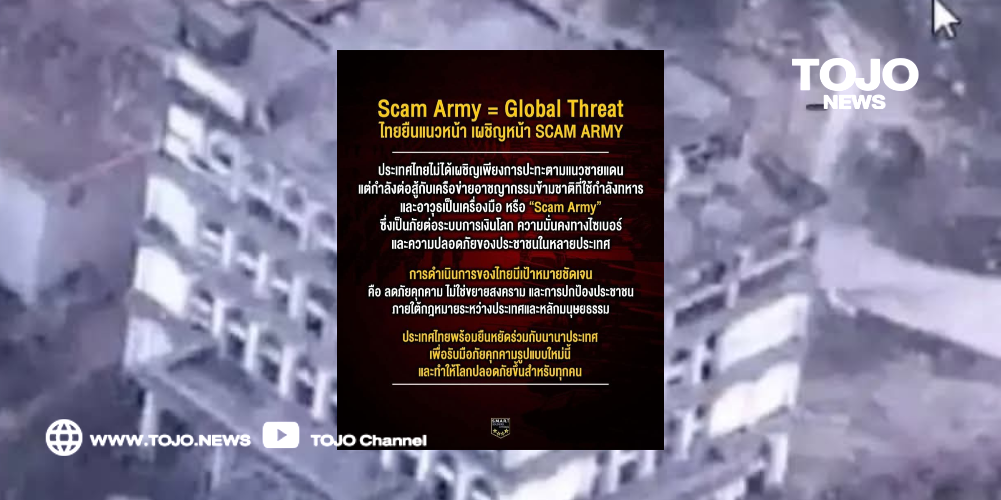 ผู้สื่อข่าวโตโจ้นิวส์รายงานว่า วันที่ 20 ธันวาคม 2568 ศูนย์ประชาสัมพันธ์กองทัพภาคที่ 2 เผยแพร่สารสื่อสารเชิงยุทธศาสตร์ ภายใต้หัวข้อ SMART Soldiers Update | Scam Army #ภัยคุกคามของโลกในยุคปัจจุบัน ย้ำ จุดยืนของประเทศไทย ต่อสถานการณ์ความตึงเครียดบริเวณชายแดนไทย–กัมพูชา ว่า #ไม่ใช่การทำสงครามกับประเทศเพื่อนบ้าน แต่เป็นการ #ต่อสู้กับเครือข่ายอาชญากรรมข้ามชาติ ที่สร้างความเสียหายเป็นวงกว้างต่อประชาคมโลก
