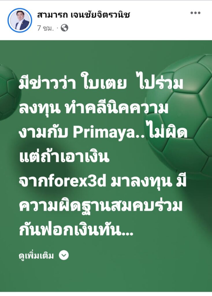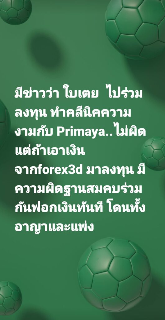 ” มีข่าวว่า ใบเตย ไปร่วมลงทุน ทำคลินิคความงามกับ Primaya..ไม่ผิด แต่ถ้าเอาเงินจาก forex3d มาลงทุน มีความผิดฐานสมคบร่วมกันฟอกเงินทันที โดนทั้งอาญาและแพ่ง”
