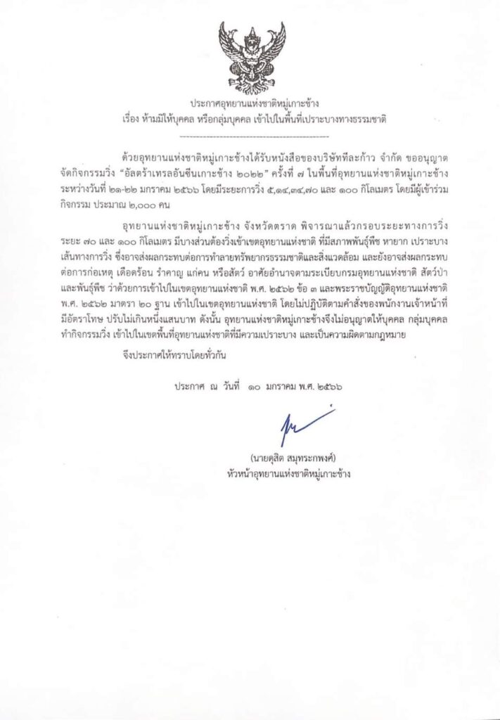 ผู้สื่อข่าวโตโจ้นิวส์รายงานว่า เพจอุทยานแห่งชาติหมู่เกาะช้าง เผยแพร่ข้อความเอกสารระบุว่า กรณีบริษัท ทีละก้าว จำกัด ขออนุญาตจัดกิจกรรมวิ่ง “อันตร้าเทรลอันซีนเกาะช้าง 2022 “ ครั้งที่ 7 ซึ่งระยะทางการวิ่งมีบางส่วนอยู่ในเขตพื้นที่อุทยานแห่งชาติหมู่เกาะช้าง ซึ่งอาจส่งผลกระทบต่อการทำลายทรัพยากรธรรมชาติและความปลอดภัยต่อผู้เข้าร่วมกิจกรรม เนื่องจากเส้นทางการวิ่งในเขตอุทยานฯ เป็นป่าสมบูรณ์และเป็นป่าลุ่มน้ำชั้น 1A
