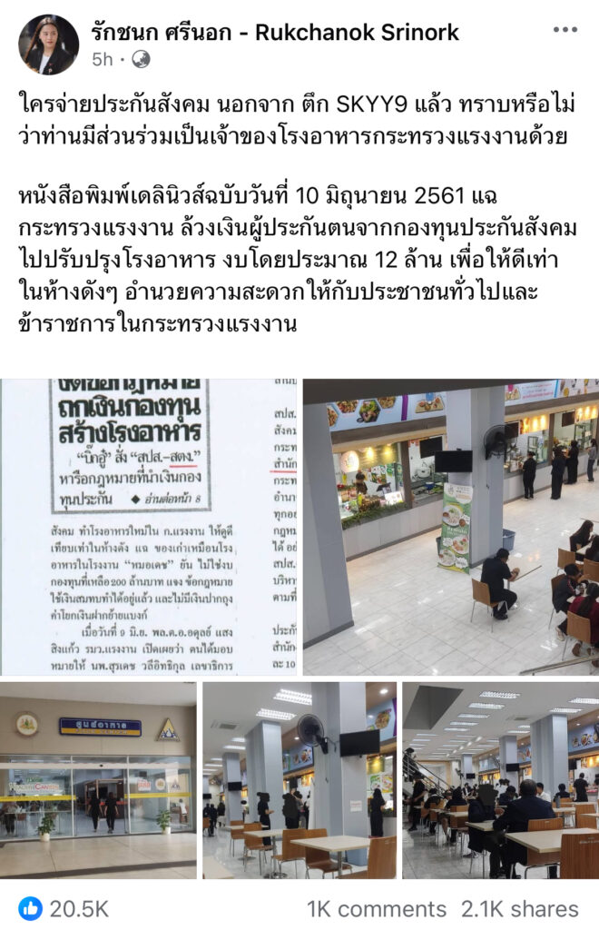กระทรวงแรงงาน ล้วงเงินผู้ประกันตนจากกองทุนประกันสังคมไปปรับปรุงโรงอาหาร งบโดยประมาณ 12 ล้าน เพื่อให้ดีเท่าในห้างดังๆ อำนวยความสะดวกให้กับประชาชนทั่วไปและข้าราชการในกระทรวงแรงงาน