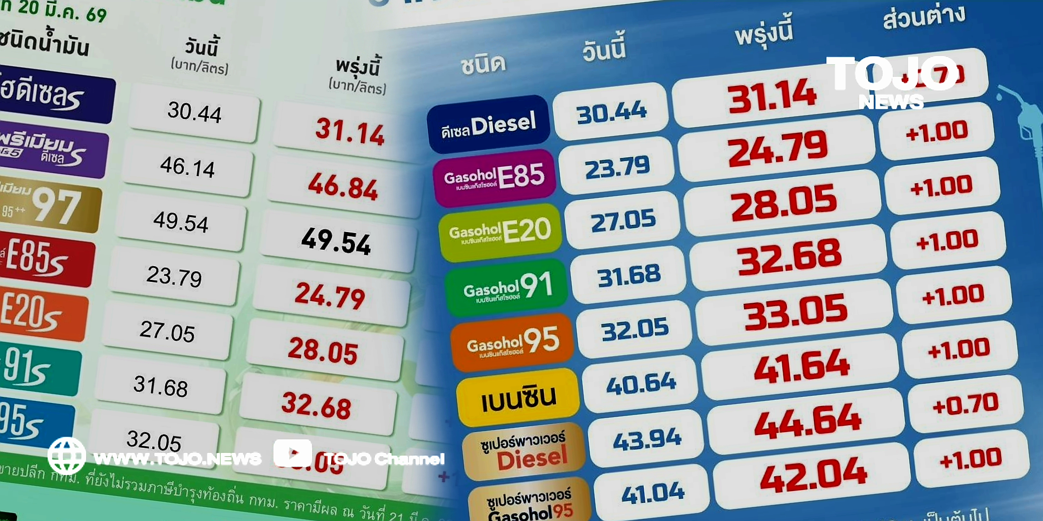 ราคาน้ำมันปรับขึ้น เบนซิน แก๊สโซฮอล์พุ่ง 1 บาท ดีเซลขยับ 70 สต. มีผล 05.00 น. (21 มี.ค.2569)
