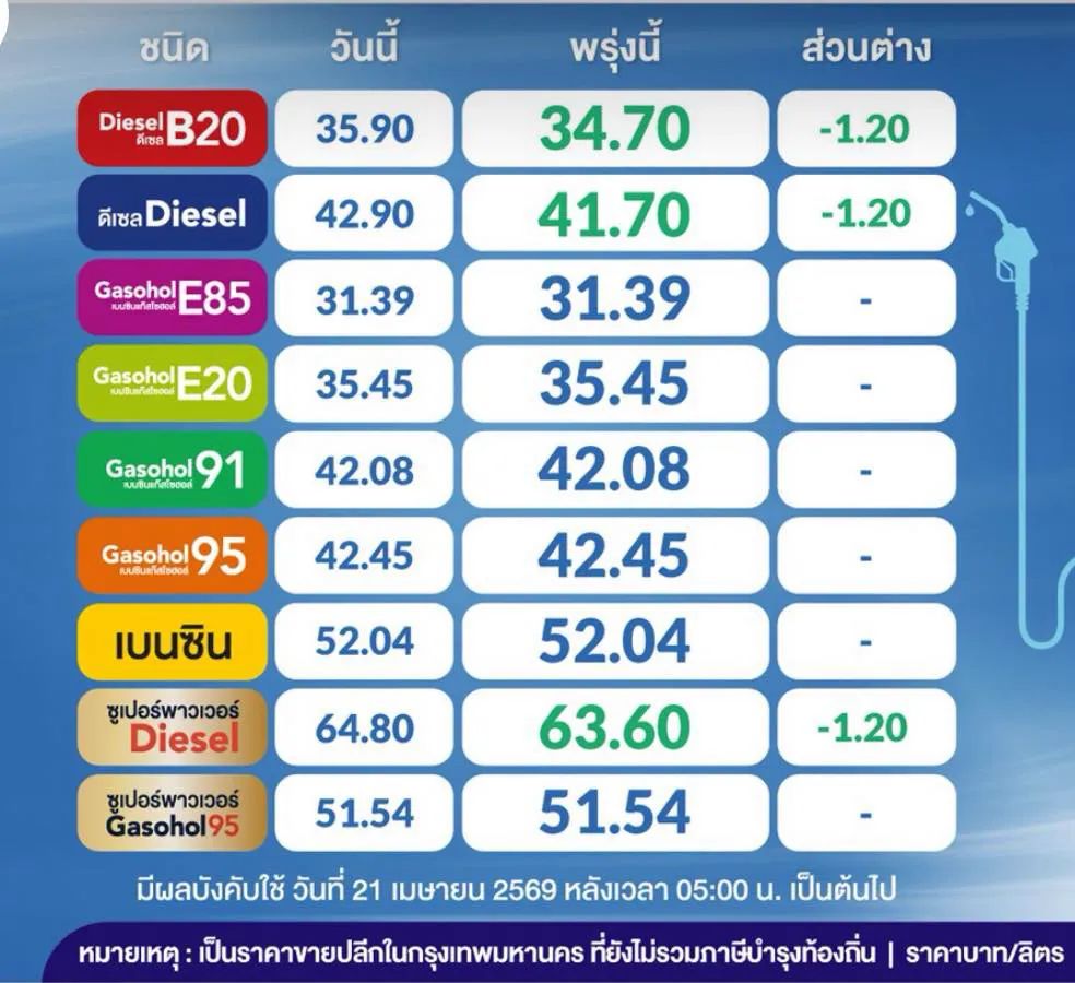 ราคาน้ำมัน 21 เม.ย.2569 ปรับราคาขายปลีกน้ำมัน กลุ่มดีเซลทุกชนิด ลดลง 1.20 บาท