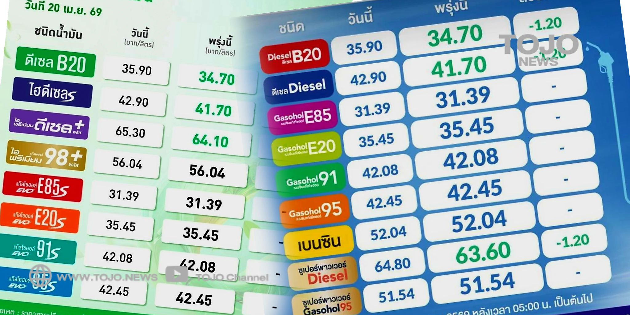 ผู้สื่อข่าวโตโจ้นิวส์รายงานว่า PTT Station – บางจาก ปรับราคาขายปลีกน้ำมัน กลุ่มดีเซลทุกชนิด ลดลง 1.20 บาทต่อลิตร ส่วนน้ำมันชนิดอื่นคงเดิม มีผล 21 เม.ย. 2569 เวลา 05.00 น. เป็นต้นไป