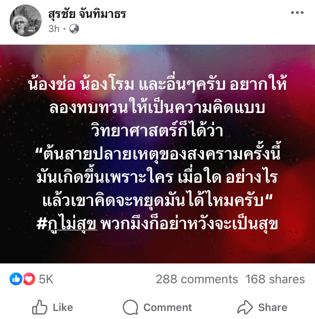 ผู้สื่อข่าวโตโจ้นิวส์รายงานว่า นายสุรชัย จันทิมาธร หรือรู้จักในชื่อ หงา คาราวาน นักร้องและนักแต่งเพลงชื่อดัง โพสต์ข้อความผ่านเฟซบุ๊ก ระบุว่า