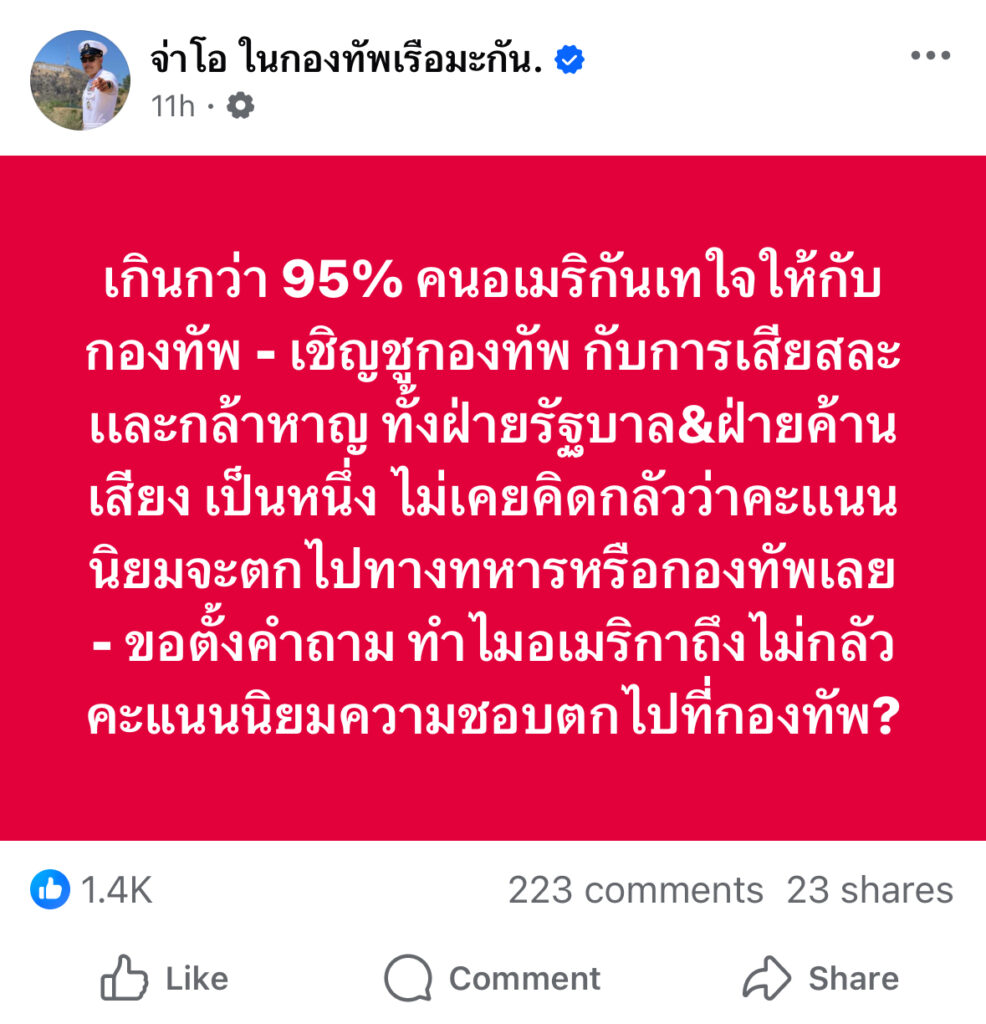 จ่าโอ เผยสถานการณ์ของอเมริกา ประชาชนส่วนมากชอบกองทัพ ส่วนฝ่ายการเมืองไม่เคยกลัวเสียคะแนนนิยม