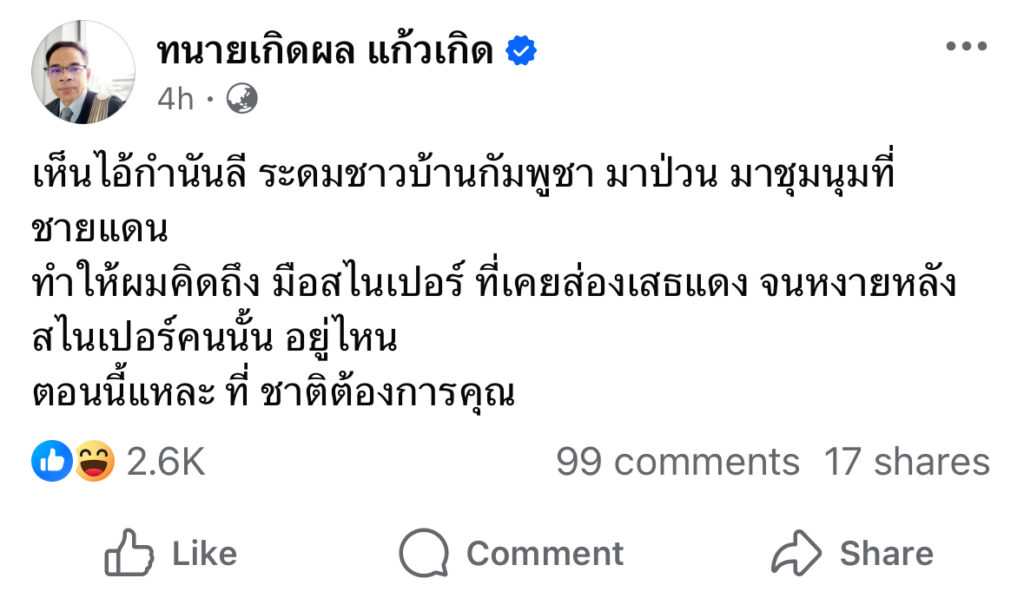 ทนายเกิดผล เรียกหามือสไนเปอร์ที่เคยส่องเสธแดง ให้มาช่วยสถานการณ์ชายแดน หลังกำนันลีขนม็อบมาป่วน