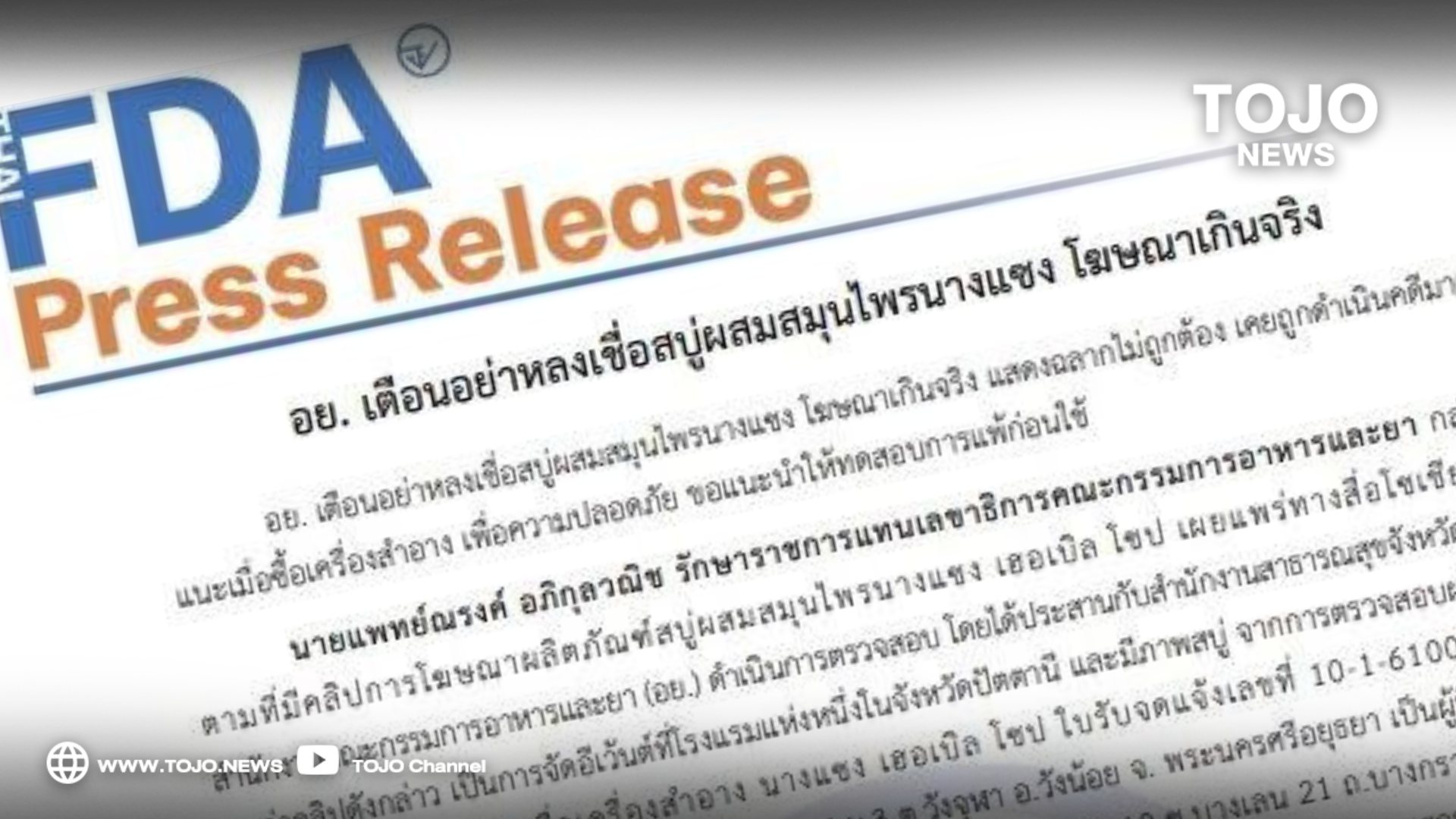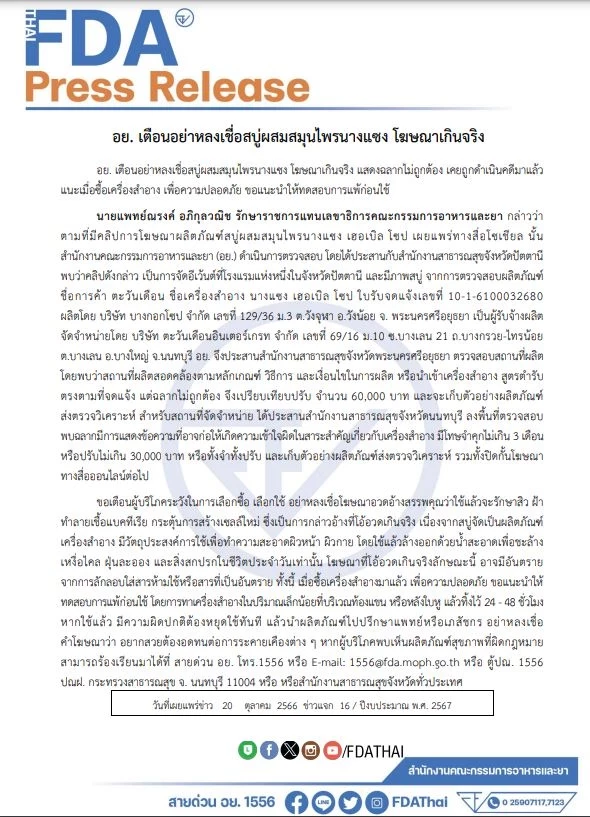 ผู้สื่อข่าวโตโจ้นิวส์รายงานว่า นายแพทย์ณรงค์ อภิกุลวณิช รักษาราชการแทนเลขาธิการคณะกรรมการอาหารและยา กล่าวว่า ตามที่มีคลิปการโฆษณาผลิตภัณฑ์สบู่นางแซง เฮอเบิล โซป เผยแพร่ทางสื่อโซเชียล นั้น