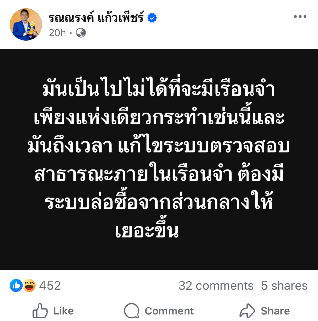 ทนายรณณรงค์ ไม่เชื่อ จะมีที่เรือนจำเพียงแห่งเดียว จี้ ถึงเวลา ตรวจสอบสาธารณะภายในเรือนจำ