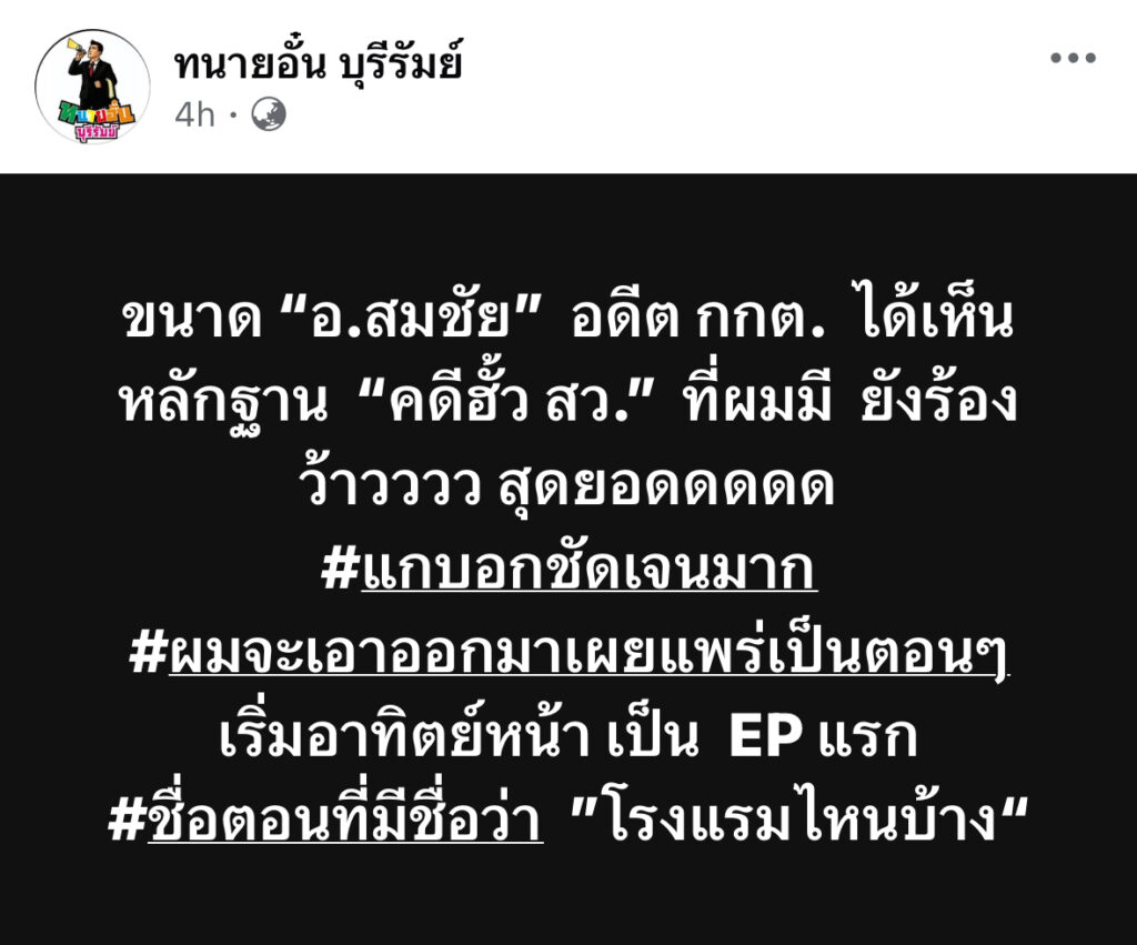 ผู้สื่อข่าวโตโจ้นิวส์รายงานว่า นายภัทรพงศ์ ศุภอักษร หรือทนายอั๋น บุรีรัมย์ โพสต์ข้อความผ่านเฟซบุ๊ก ระบุว่า