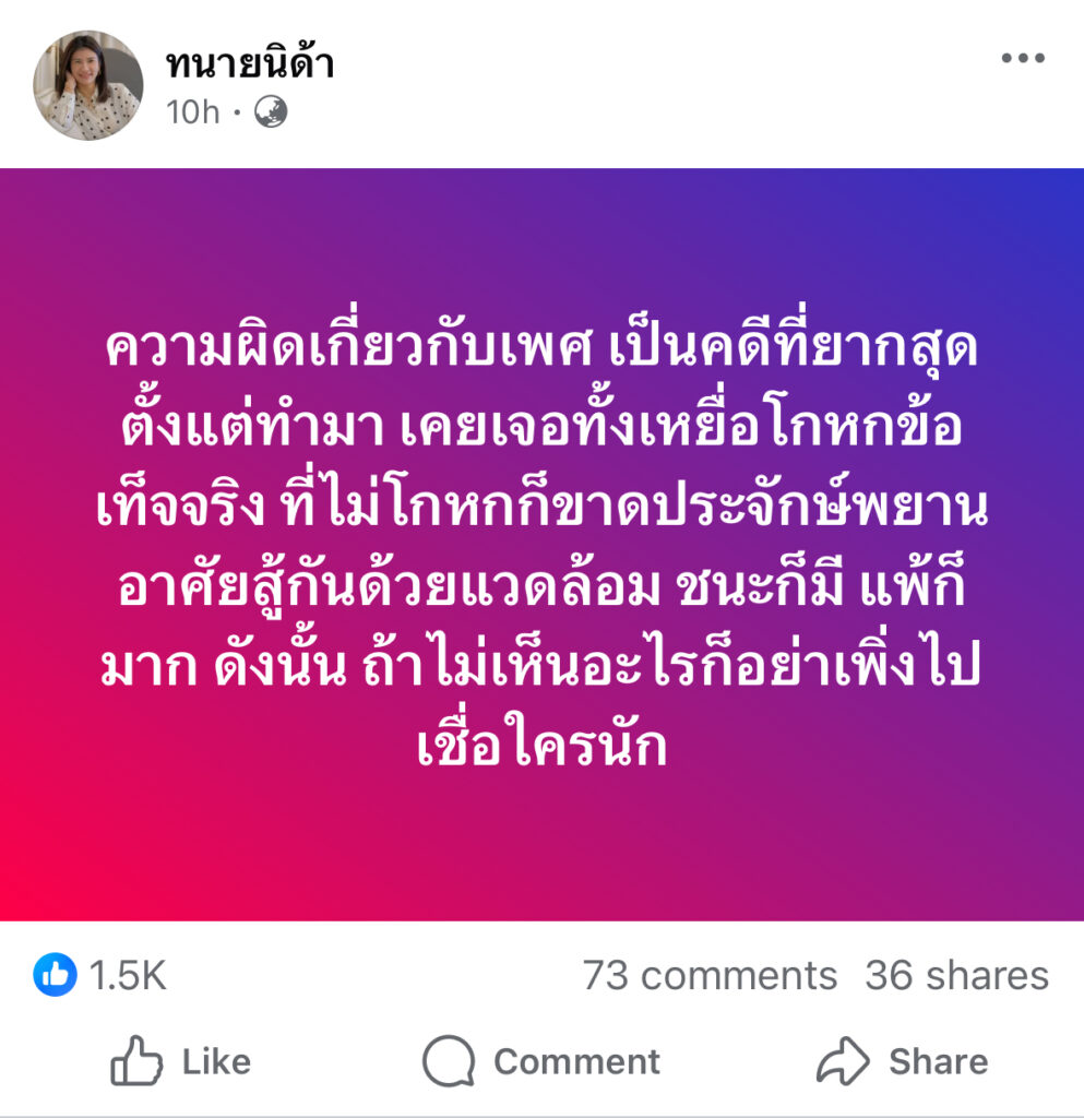ทนายนิด้า เคลื่อนไหว ความผิดเกี่ยวกับเพศ เพราะอะไร? เป็นคดีที่ยากสุดตั้งแต่ทำมา!