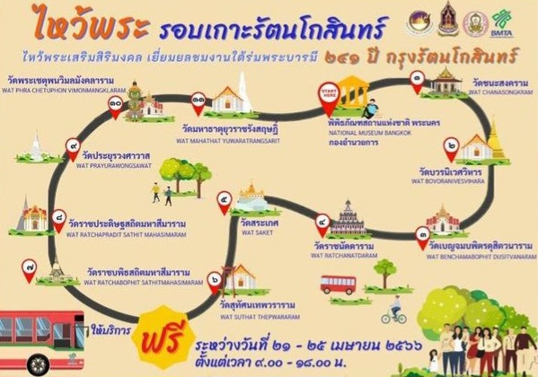 ขสมก. ได้สนับสนุนการจัดกิจกรรมดังกล่าว โดยจัดรถโดยสารธรรมดา (รถเมล์ร้อน) ให้บริการฟรี จำนวน 5 คัน เพื่ออำนวยความสะดวกให้กับประชาชนเดินทางเข้าร่วมกิจกรรมไหว้พระเสริมสิริมงคล เยี่ยมชมวัดบริเวณรอบเกาะรัตนโกสินทร์ จำนวน 11 แห่ง ดังนี้