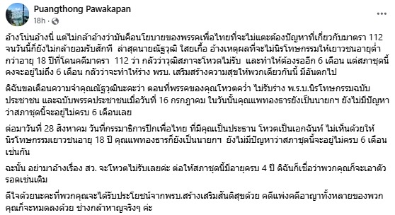 อ้างโน่นอ้างนี่ แต่ไม่กล้าอ้างว่ามันคือนโยบายของพรรคเพื่อไทยที่จะไม่แตะต้องปัญหาที่เกี่ยวกับมาตรา 112 จนวันนี้ก็ยังไม่กล้ายอมรับสักที ล่าสุดนายณัฐวุฒิ ใสยเกื้อ อ้างเหตุผลที่จะไม่นิรโทษกรรมให้เยาวชนอายุต่ำกว่าอายุ 18 ปีที่โดนคดีมาตรา 112 ว่า กลัวว่าวุฒิสภาจะโหวตไม่รับ และทำให้ต้องรออีก 6 เดือน แต่สภาชุดนี้คงจะอยู่ไม่ถึง 6 เดือน กลัวว่าจะทำให้ร่าง พรบ. เสริมสร้างความสุขให้พวกเดียวกันนี้ มีอันตกไป