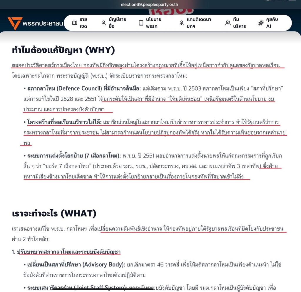 เว็บไซต์ของพรรคประชาชนได้เผยแพร่นโยบายทางด้านกองทัพ เห็นได้ชัดเจนว่าพรรคประชาชนมีนโยบายเปลี่ยนกฎหมายให้อำนาจนักการเมืองอยู่เหนือกองทัพ ลดอำนาจสภากลาโหมให้กลายเป็นสภาที่ปรึกษา โดยให้การตัดสินใจเป็นของฝ่ายการเมืองแทน ลองย้อนกลับไปดูว่าถ้าอำนาจของนายพลของกองทัพไปอยู่กับนักการเมืองที่ผ่านมา ผลลัพธ์จะเป็นอย่างไร คุณคิดอย่างไรกับนโยบายนี้
