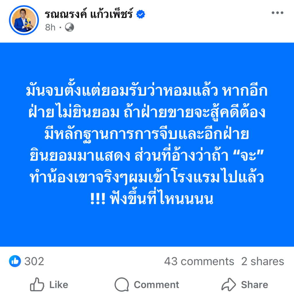 ผู้สื่อข่าวโตโจ้นิวส์รายงานว่า นายรณณรงค์ แก้วเพ็ชร์ ทนายความชื่อดัง โพสต์ข้อความผ่านเฟซบุ๊ก ระบุว่า