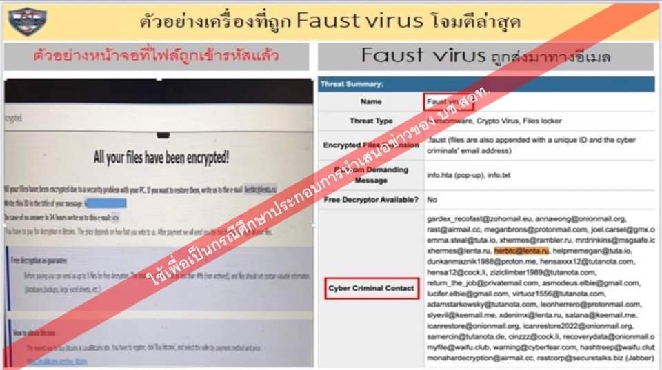 ในช่วงที่ผ่านมาพนักงานสอบสวน บช.สอท. ได้รับแจ้งความร้องทุกข์จากผู้เสียหายว่า บริษัทของผู้เสียหายได้รับความเสียหายจากการถูมัลแวร์เรียกค่าไถ่ (Ransomware) ถูกล็อกไฟล์ข้อมูล ไม่สามารถเข้าถึงและใช้งานได้ มีการเรียกค่าไถ่เป็นบิตคอยน์ (Bitcoin) มูลค่าหลายล้านบาท กรณีดังกล่าว บช.สอท. ได้ร่วมกับ สำนักงานคณะกรรมการการรักษาความมั่นคงปลอดภัยไซเบอร์แห่งชาติ (สกมช.) ได้ทำการตรวจสอบและวิเคราะห์ในเบื้องต้นพบว่า คอมพิวเตอร์บริษัทของผู้เสียหายถูกโจมตีด้วย Faust Virus หรือ Ransomware ซึ่งได้รับการออกแบบมาโดยเฉพาะเพื่อป้องกันไม่ให้เหยื่อเข้าถึงข้อมูลของตนเอง โดยแผนประทุษกรรมของคนร้ายจะ สร้างมัลแวร์ที่มีลักษณะการทำงานแบบเข้ารหัส หรือล็อกไฟล์ ไม่ว่าจะเป็นไฟล์เอกสาร รูปภาพ วิดีโอ ผู้ใช้งานจะไม่สามารถเปิดไฟล์ได้ จนกว่าจะได้รับรหัส หรือคีย์ที่ใช้ในการปลดล็อกไฟล์