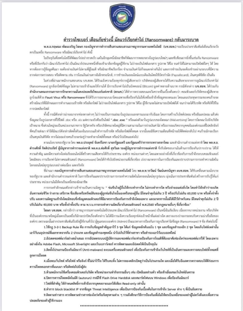 ผู้สื่อข่าวโตโจ้นิวส์รายงานว่า พ.ต.อ.กฤษณะ พัฒนเจริญ โฆษก กองบัญชาการตำรวจสืบสวนสอบสวนอาชญากรรมทางเทคโนโลยี (บช.สอท.) ขอเรียนประชาสัมพันธ์เตือนภัยระวังตกเป็นเหยื่อ Ransomware หรือมัลแวร์เรียกค่าไถ่ ดังนี้