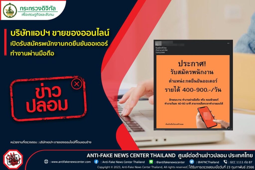 ผู้สื่อข่าวโตโจ้นิวส์รายงานว่า ตามที่มีการเผยแพร่โฆษณาสมัครงานเรื่องบริษัทแอปฯ ขายของออนไลน์ เปิดรับสมัครพนักงานกดยืนยันออเดอร์ ทำงานผ่านมือถือ ทางศูนย์ต่อต้านข่าวปลอมได้ตรวจสอบข้อเท็จจริงกับทางบริษัทแอปฯ ขายของออนไลน์ที่โดนแอบอ้าง พบว่าข้อมูลดังกล่าวนั้น เป็นข้อมูลเท็จ
