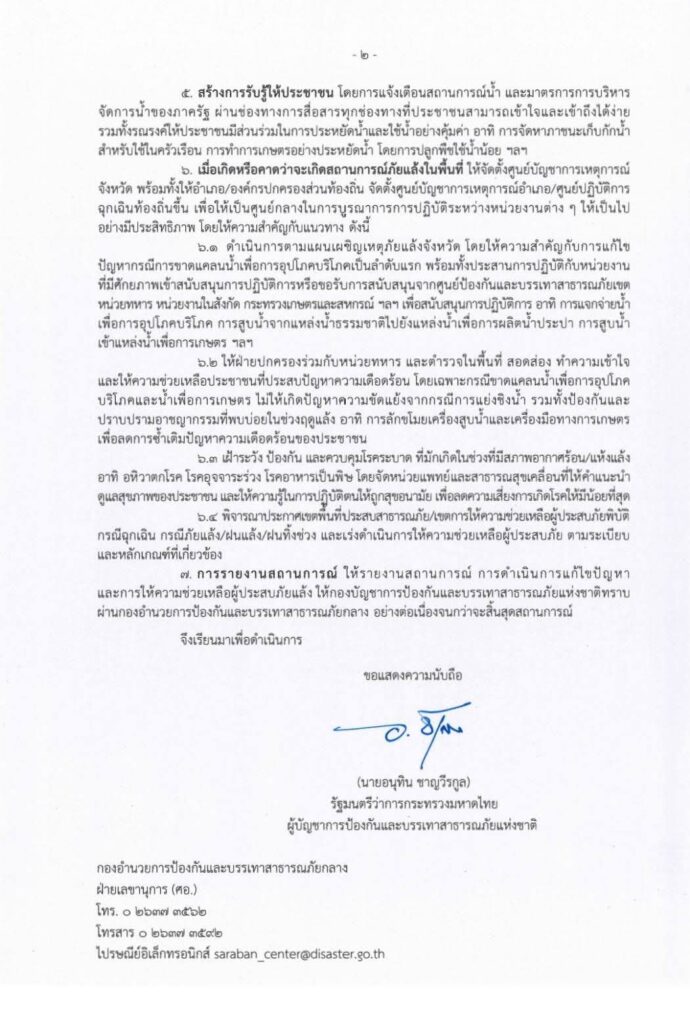 “ในสภาวะภัยแล้งนอกจากการเร่งให้ความช่วยเหลือเรื่องน้ำกินน้ำใช้ของพี่น้องประชาชน สิ่งสำคัญที่ต้องดูแลควบคู่ไปด้วย คือ ด้านการดูแลสุขภาวะของประชาชน โดยขอให้มีการจัดหน่วยแพทย์และสาธารณสุขเคลื่อนที่ออกให้คำแนะนำ เฝ้าระวังและป้องกันโรคระบาดที่มากับอากาศร้อน อาทิ โรคท้องร่วง อหิวาตกโรค โรคอาหารเป็นพิษ พร้อมทั้งรณรงค์สร้างการรับรู้ให้ประชาชนตระหนักถึงคุณค่าของทรัพยากรน้ำ รู้จักใช้น้ำอย่างประหยัดที่สุด และดูแลปฏิบัติตนให้ถูกสุขอนามัยด้วย และให้ทุกจังหวัดรายงานสถานการณ์และการดำเนินงานให้กองบัญชาการป้องกันและบรรเทาสาธารณภัยแห่งชาติทราบอย่างต่อเนื่อง จนกว่าสถานการณ์จะคลี่คลายเข้าสู่ภาวะปกติ เพื่อร่วมกัน “บำบัดทุกข์ บำรุงสุข” พี่น้องประชาชนสามารถผ่านพ้นวิกฤตภัยแล้งในปีนี้ไปได้ด้วยความปลอดภัยและมีผลกระทบน้อยที่สุด โดยพี่น้องประชาชนที่ได้รับผลกระทบสามารถขอความช่วยเหลือผ่านสายด่วนนิรภัย กรมป้องกันและบรรเทาสาธารณภัย หมายเลข 1784 ตลอด 24 ชั่วโมง” ปลัดกระทรวงมหาดไทย กล่าวในช่วงท้าย