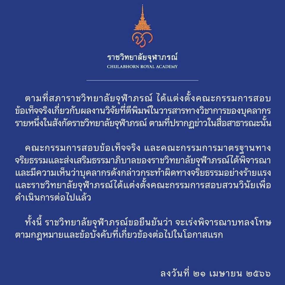 ทั้งนี้ ราชวิทยาลัยจุฬาภรณ์ขอยืนยันว่า จะเร่งพิจารณาบทลงโทษตามกฎหมายและข้อบังคับที่เกี่ยวข้องต่อไปในโอกาสแรก