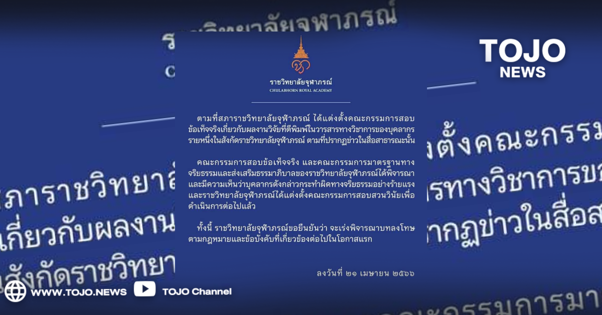 ราชวิทยาลัยจุฬาภรณ์ เผยผลสอบ กรณีนักวิชาการซื้องานวิจัยใส่ชื่อตัวเอง พบผิดจริยธรรมร้ายแรง เร่งพิจารณาบทลงโทษตามกฎหมาย