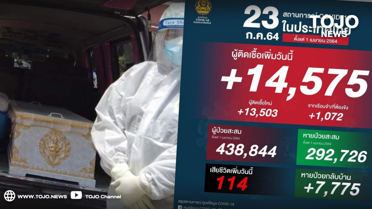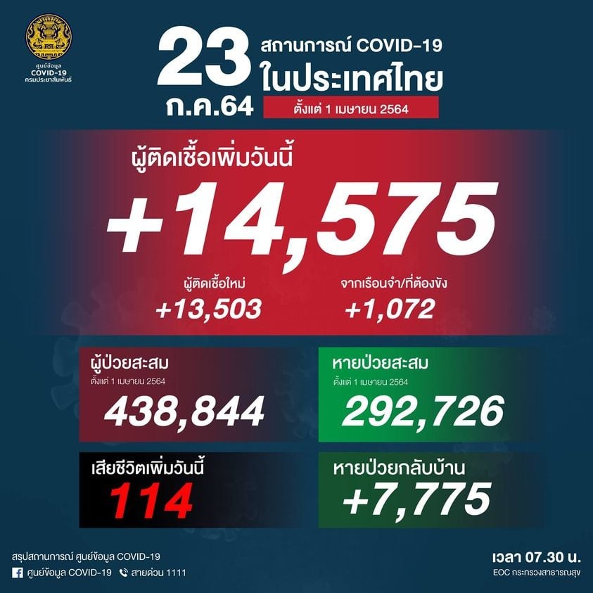 ศบค.สรุปยอดผู้ติดเชื้อวันนี้ ( 23 ก.ค.64) พบติดเชื้อ 14,575 ราย เสียชีวิต 114 ราย