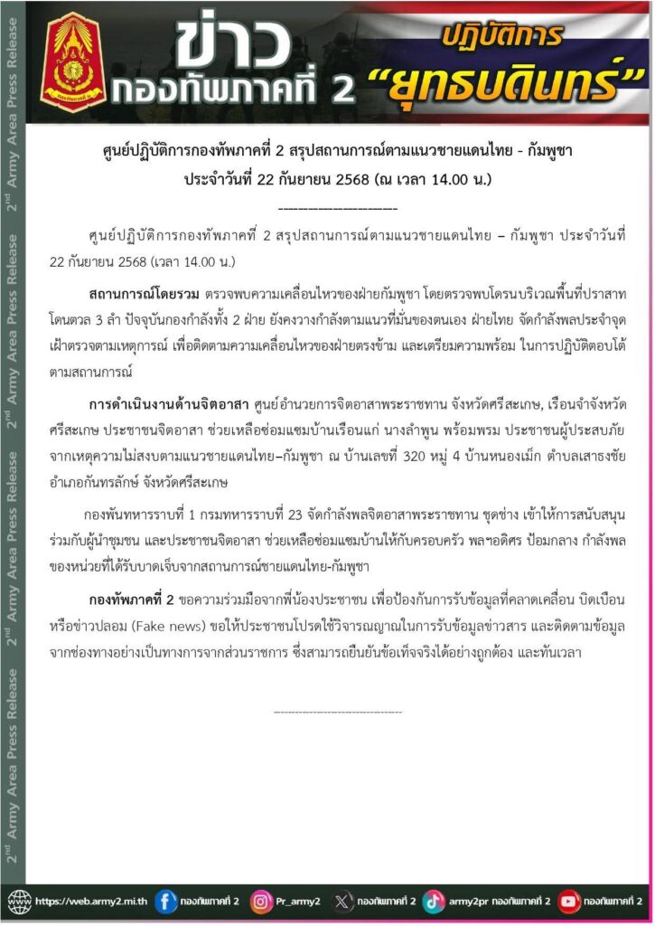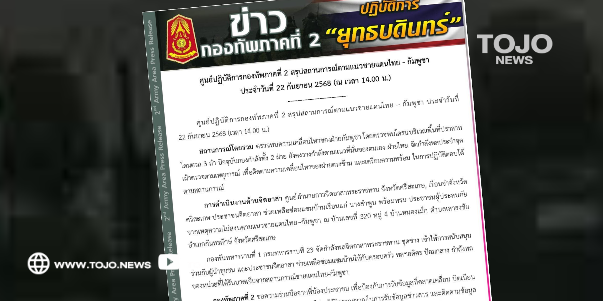 ผู้สื่อข่าวโตโจ้นิวส์รายงานว่า ศูนย์ปฏิบัติการกองทัพภาคที่ 2 สรุปสถานการณ์ตามแนวชายแดนไทย – กัมพูชา ประจำวันที่