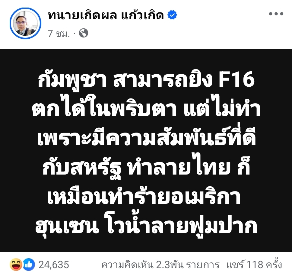กัมพูชา สามารถยิง F16 ตกได้ในพริบตา แต่ไม่ทำเพราะมีความสัมพันธ์ที่ดีกับสหรัฐ ทำลายไทย ก็เหมือนทำร้ายอเมริกา
