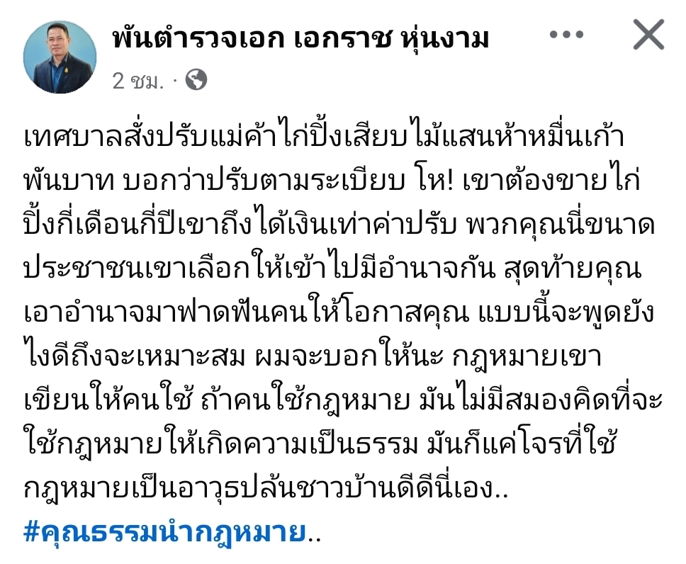เทศบาลสั่งปรับแม่ค้าไก่ปิ้งเสียบไม้แสนห้าหมื่นเก้าพันบาท บอกว่าปรับตามระเบียบ โห! เขาต้องขายไก่ปิ้งกี่เดือนกี่ปีเขาถึงได้เงินเท่าค่าปรับ พวกคุณนี่ขนาดประชาชนเขาเลือกให้เข้าไปมีอำนาจกัน สุดท้ายคุณเอาอำนาจมาฟาดฟันคนให้โอกาสคุณ แบบนี้จะพูดยังไงดีถึงจะเหมาะสม
