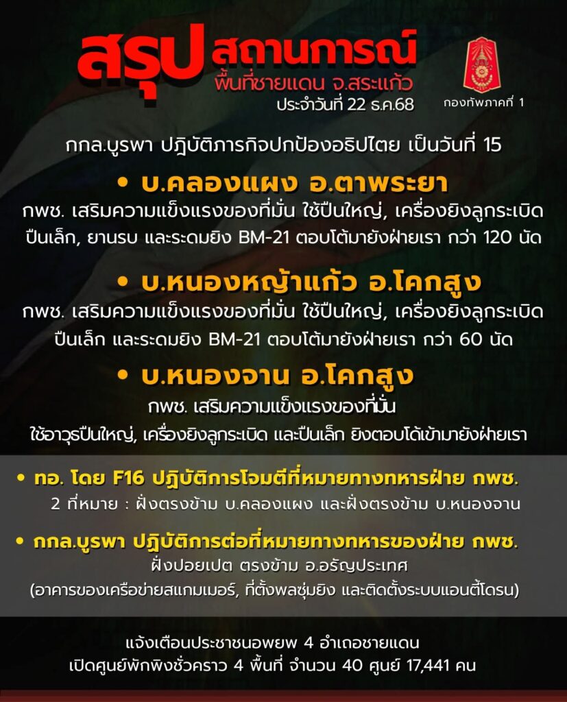 ผู้สื่อข่าวโตโจ้นิวส์รายงานว่า ศูนย์ปฏิบัติการกองทัพภาคที่ 1 สรุปสถานการณ์ชายแดนไทย-กัมพูชา พื้นที่ จ.สระแก้ว ประจำวัน 22 ธันวาคม 2568 เวลา 18.00 น.