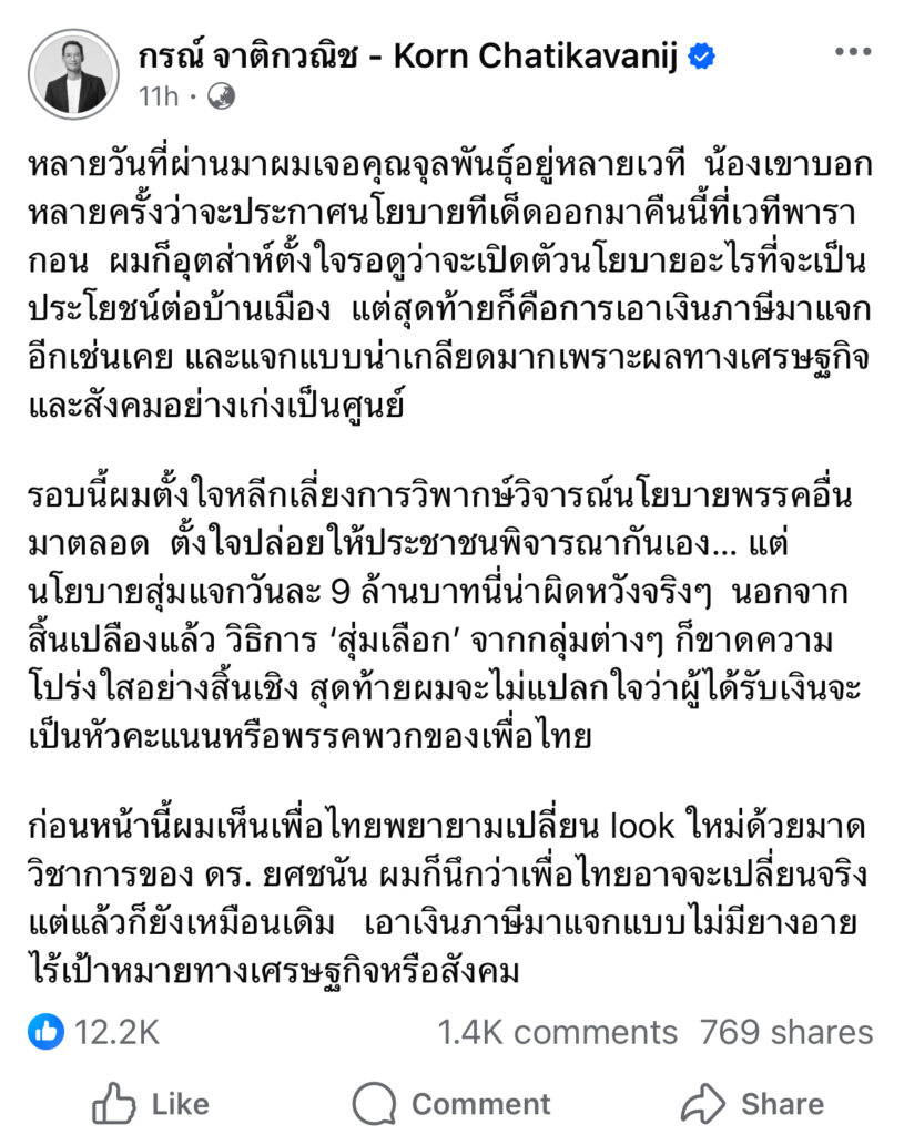 รอบนี้ผมตั้งใจหลีกเลี่ยงการวิพากษ์วิจารณ์นโยบายพรรคอื่นมาตลอด ตั้งใจปล่อยให้ประชาชนพิจารณากันเอง… แต่นโยบายสุ่มแจกวันละ 9 ล้านบาทนี่น่าผิดหวังจริงๆ นอกจากสิ้นเปลืองแล้ว วิธิการ ‘สุ่มเลือก’ จากกลุ่มต่างๆ ก็ขาดความโปร่งใสอย่างสิ้นเชิง สุดท้ายผมจะไม่แปลกใจว่าผู้ได้รับเงินจะเป็นหัวคะแนนหรือพรรคพวกของเพื่อไทย