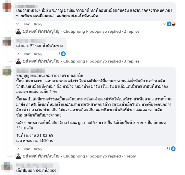 โดยมีชาวเน็ตเข้ามาแสดงความคิดเห็น เช่น ถามปั้มปตท.แถวห้วยปราบ บอกว่าดีเซลมาส่งวันละ40,000ลิตร, ยืนยัน จาก8 ลดงเหลือ2 ปั๊มเล็ก โนเนม, ขออนุญาตตอบนะคะ..รายงานจากต.บ่อวิน