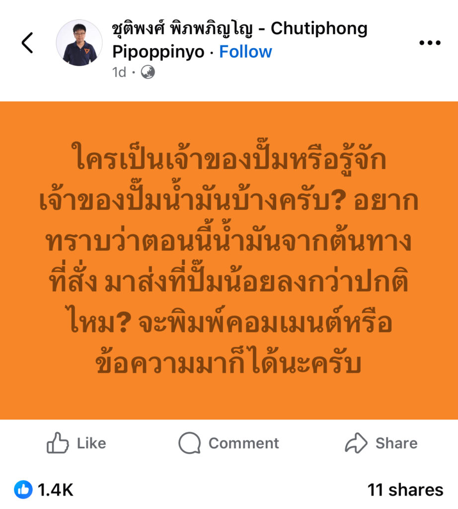 ชาวเน็ตแห่คอมเมนต์! ชุติพงศ์ ถาม ใครเป็นเจ้าของปั๊ม น้ำมันมาส่งน้อยลงไหม?