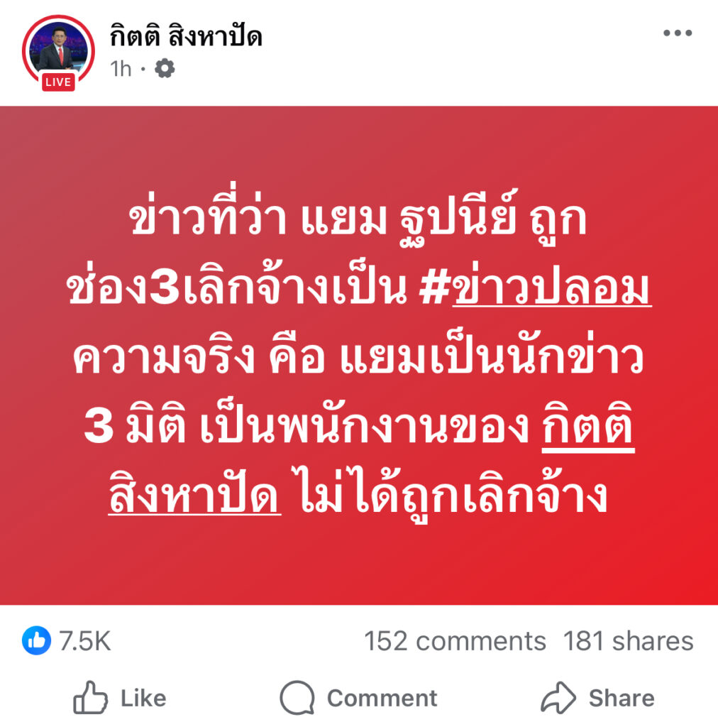 ข่าวที่ว่า แยม ฐปนีย์ ถูกช่อง3เลิกจ้างเป็น #ข่าวปลอม ความจริง คือ แยมเป็นนักข่าว 3 มิติ เป็นพนักงานของ กิตติ สิงหาปัด ไม่ได้ถูกเลิกจ้าง