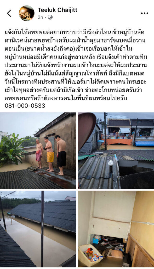 คนหาดใหญ่ เล่าสถานการณ์หน้างานของหมู่บ้านลัดดานิเวศน์ แจ้งให้อพยพแต่ยังไม่มีเรือมา ส่วนในหมู่บ้านไม่มีแม้แต่สัญญาณให้ประสานกับเจ้าหน้าที่