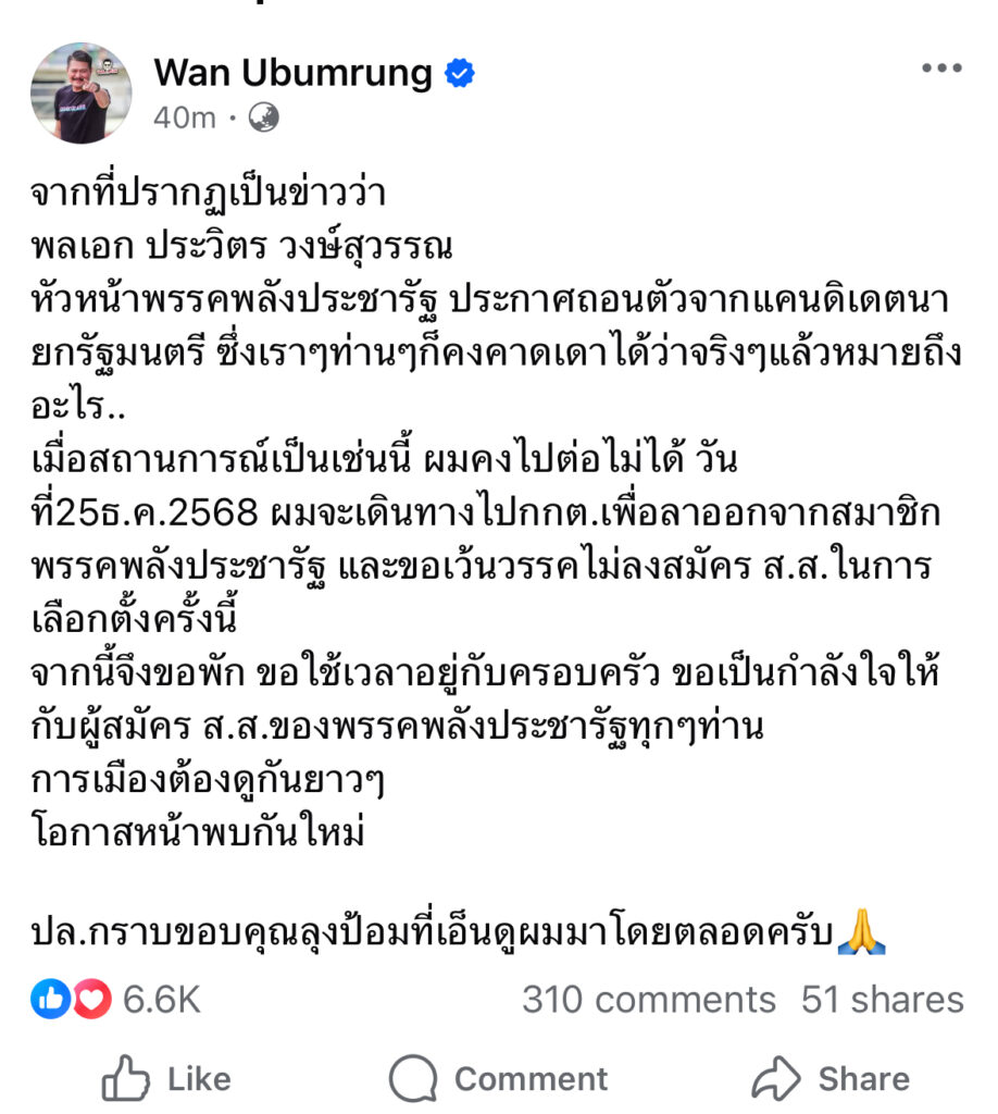 เมื่อสถานการณ์เป็นเช่นนี้ ผมคงไปต่อไม่ได้ วันที่25ธ.ค.2568 ผมจะเดินทางไปกกต.เพื่อลาออกจากสมาชิกพรรคพลังประชารัฐ และขอเว้นวรรคไม่ลงสมัคร ส.ส.ในการเลือกตั้งครั้งนี้