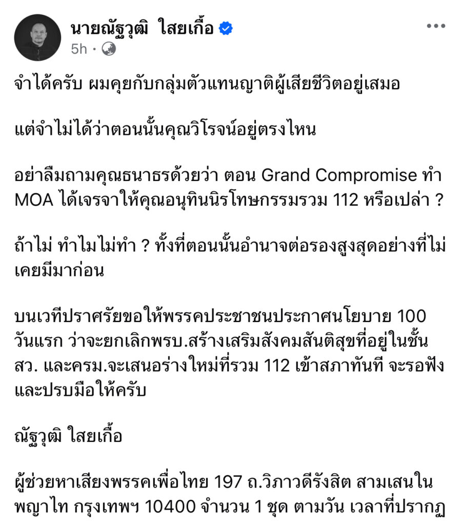 อย่าลืมถามคุณธนาธรด้วยว่า ตอน Grand Compromise ทำ MOA ได้เจรจาให้คุณอนุทินนิรโทษกรรมรวม 112 หรือเปล่า ?