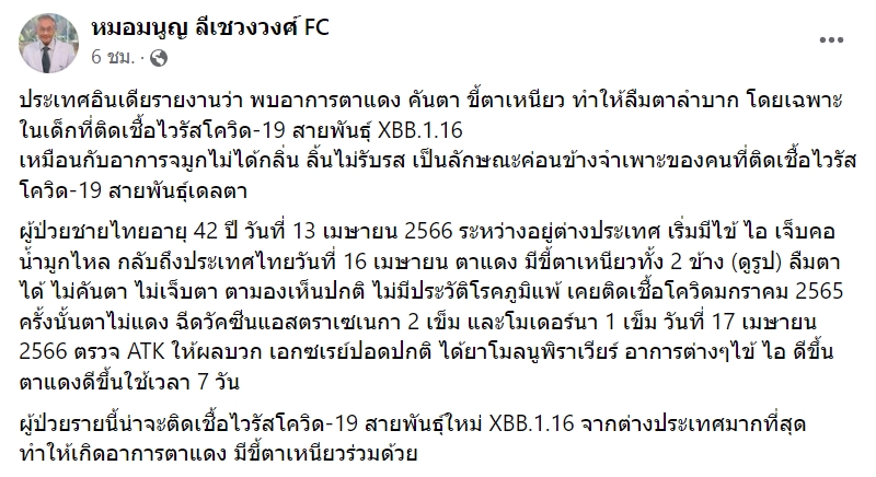ผู้ป่วยรายนี้น่าจะติดเชื้อไวรัสโควิด-19 สายพันธุ์ใหม่ XBB.1.16 จากต่างประเทศมากที่สุด ทำให้เกิดอาการตาแดง มีขี้ตาเหนียวร่วมด้วย