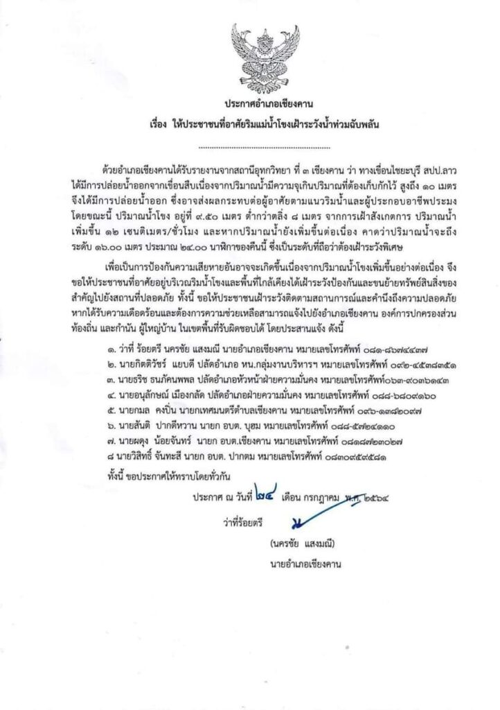 ผู้สื่อข่าวโตโจ้นิวส์รายงานว่า อำเภอเชียงคาน ประกาศ เรื่อง การเตรียมการเฝ้าระวังน้ำโขงท่วมฉับพลัน ด้วยอำเภอเชียงคานได้รับรายงานจากสถานีอุทกวิทยา ที่ 3 เชียงคาน ว่า ทางเขื่อนไชยะบุรี สปป.ลาว ได้มีการปล่อยน้ำออกจากเขื่อนสืบเนื่องจากปริมาณน้ำมีความจุเกินปริมาณที่ต้องเก็บกักไว้สูงถึง 10 เมตร