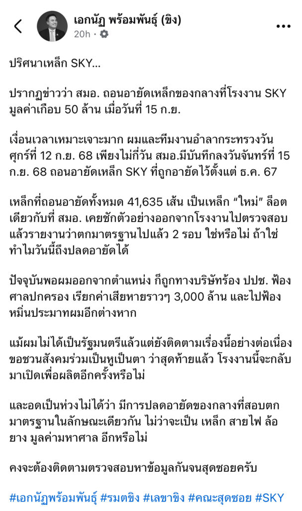 เงื่อนเวลาเหมาะเจาะมาก ผมและทีมงานอำลากระทรวงวันศุกร์ที่ 12 ก.ย. 68 เพียงไม่กี่วัน สมอ.มีบันทึกลงวันจันทร์ที่ 15 ก.ย. 68 ถอนอายัดเหล็ก SKY ที่ถูกอายัดไว้ตั้งแต่ ธ.ค. 67