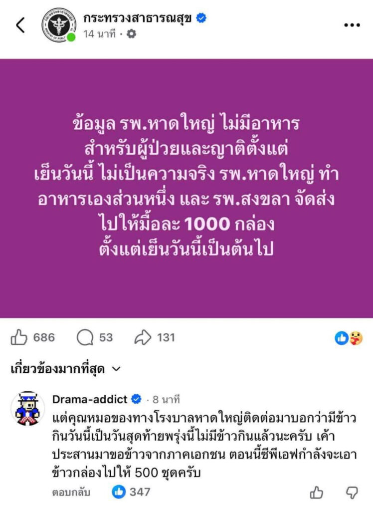 แต่คุณหมอของทางโรงบาลหาดใหญ่ติดต่อมาบอกว่ามีข้าวกินวันนี้เป็นวันสุดท้ายพรุ่งนี้ไม่มีข้าวกินแล้วนะครับ เค้าประสานมาขอข้าวจากภาคเอกชน ตอนนี้ซีพีเอฟกำลังจะเอาข้าวกล่องไปให้ 500 ชุดครับ