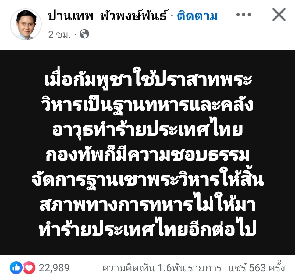 ปานเทพ ชี้ ปราสาทพระวิหารเป็นฐานทหารเขมรกองทัพมีความชอบธรรมจัดการ