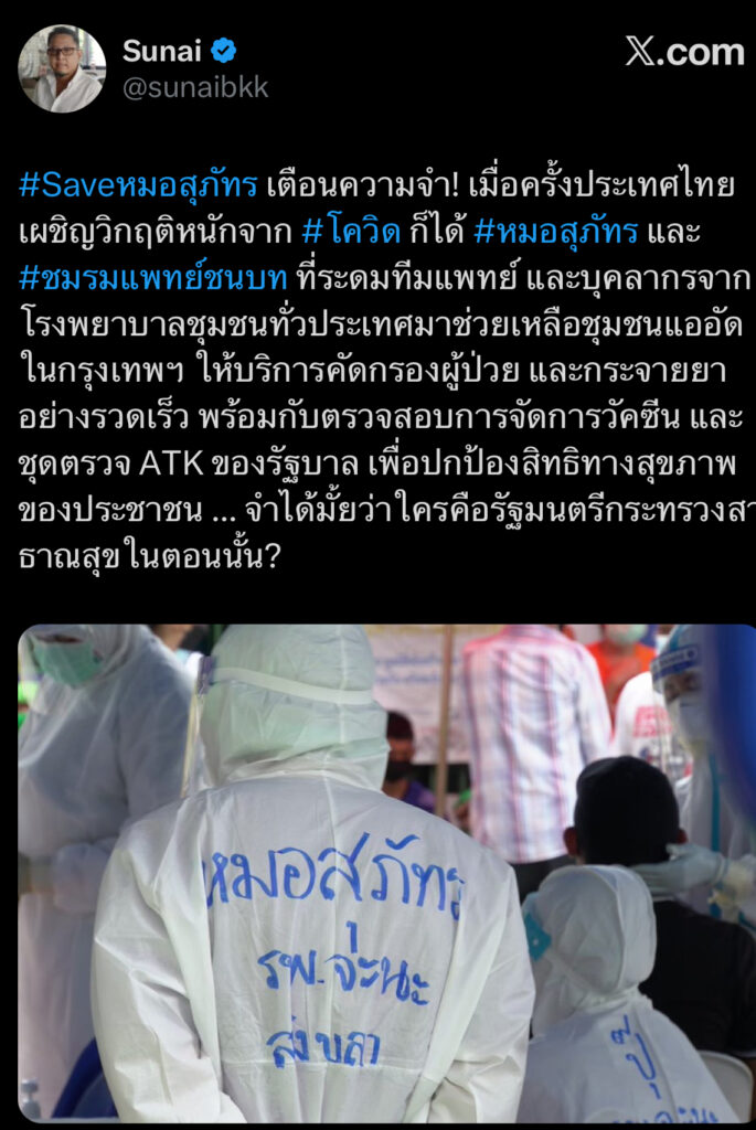 Saveหมอสุภัทร เตือนความจำ! เมื่อครั้งประเทศไทยเผชิญวิกฤติหนักจาก โควิด ก็ได้ หมอสุภัทร และ ชมรมแพทย์ชนบท ที่ระดมทีมแพทย์ และบุคลากรจากโรงพยาบาลชุมชนทั่วประเทศมาช่วยเหลือชุมชนแออัดในกรุงเทพฯ ให้บริการคัดกรองผู้ป่วย และกระจายยาอย่างรวดเร็ว พร้อมกับตรวจสอบการจัดการวัคซีน และชุดตรวจ ATK ของรัฐบาล เพื่อปกป้องสิทธิทางสุขภาพของประชาชน … จำได้มั้ยว่าใครคือรัฐมนตรีกระทรวงสาธาณสุขในตอนนั้น?