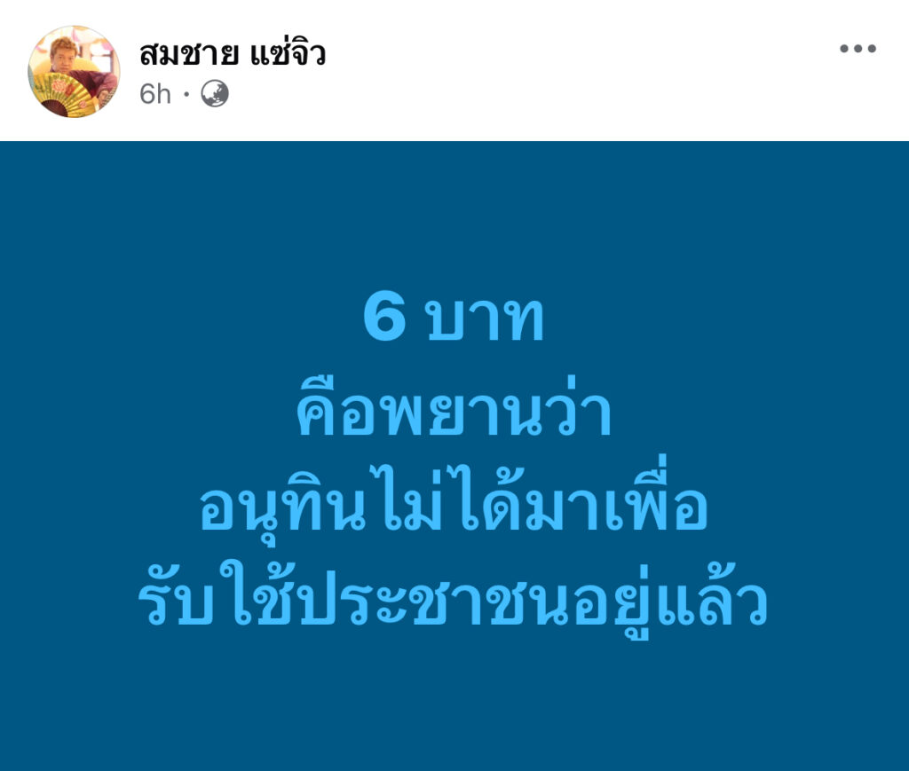สมชาย แซ่จิว โพสต์สะดุ้ง 6 บาท คือพยาน อนุทินไม่ได้มารับใช้ประชาชน