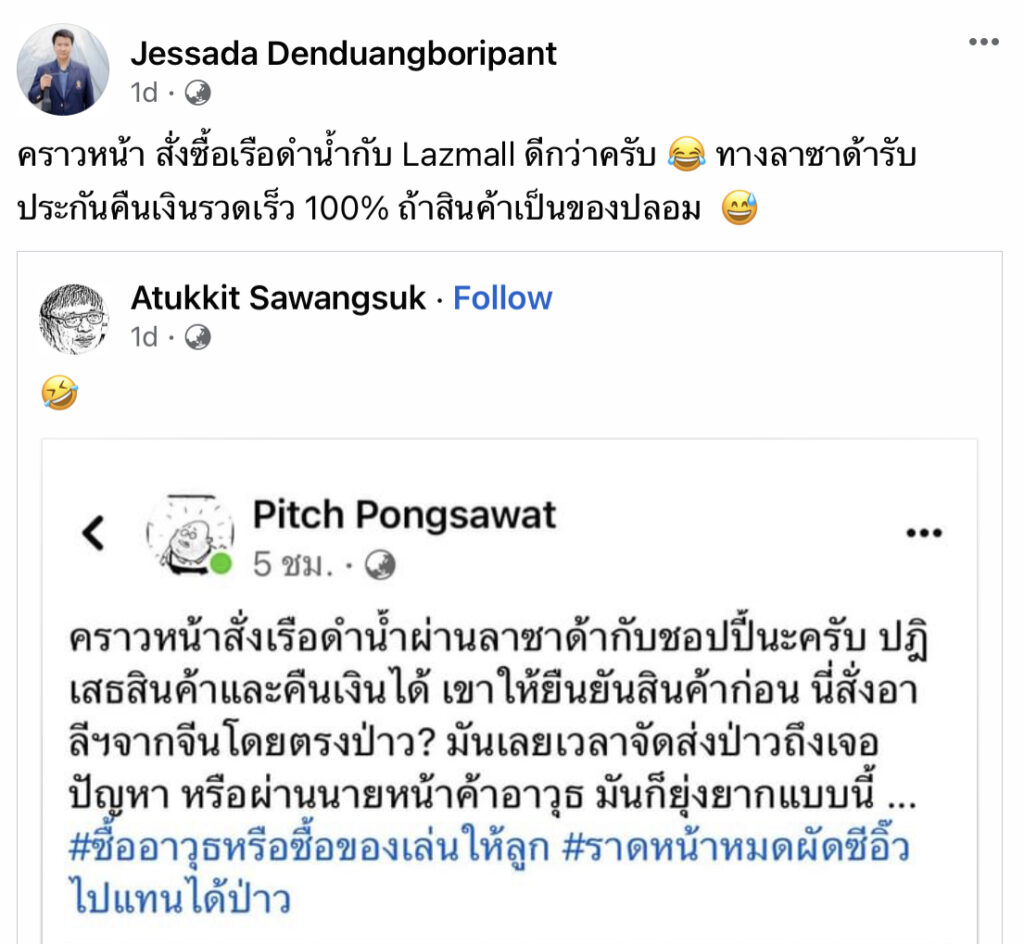 โดยอาจารย์เจษฎา ระบุว่า คราวหน้า สั่งซื้อเรือดำน้ำกับ Lazmall ดีกว่าครับ 😂 ทางลาซาด้ารับประกันคืนเงินรวดเร็ว 100% ถ้าสินค้าเป็นของปลอม 😅