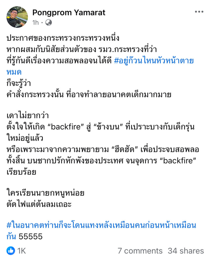 ผู้สื่อข่าวโตโจ้นิวส์รายงานว่า นายพงศ์พรหม ยามะรัต อดีตรองโฆษกพรรคสร้างอนาคตไทย โพสต์ข้อความผ่านเฟซบุ๊ก ระบุว่า
