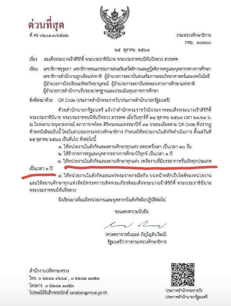 ขอเรียกร้องให้กระทรวงศึกษาธิการทบทวนคำสั่งข้อ 3 ใหม่อย่างเร่งด่วนกรณี ห้ามโรงเรียนและสถานศึกษางดจัดงานที่มีบรรยากาศรื่นเริงทุกประเภท เป็นเวลา 1 ปีเต็ม