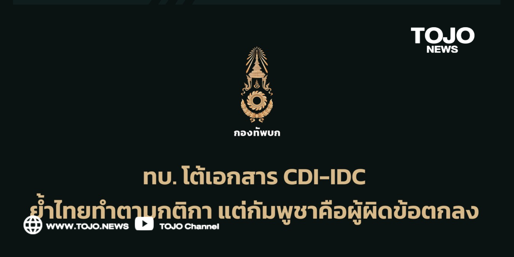 ผู้สื่อข่าวโตโจ้นิวส์รายงานว่า พลตรี วินธัย สุวารี โฆษกกองทัพบก เปิดเผยว่า เมื่อวันที่ 24 พฤศจิกายน 2568 กระทรวงกลาโหมกัมพูชาได้เผยแพร่เอกสารจากผลการประชุมคณะกรรมการบริหารและสมัชชาใหญ่ขององค์การ The Centrist Democrat International : CDI-IDC ณ เมืองเซาเปาโล ประเทศบราซิล เมื่อวันที่ 20-23 พฤศจิกายน ที่ผ่านมา ซึ่งมีเนื้อหากล่าวถึงสถานการณ์ชายแดนไทย–กัมพูชา และข้อกล่าวหาต่อฝ่ายไทยหลายประการที่ไม่ตรงกับข้อเท็จจริง กองทัพบกจึงขอชี้แจงเพื่อให้เกิดความเข้าใจที่ถูกต้อง