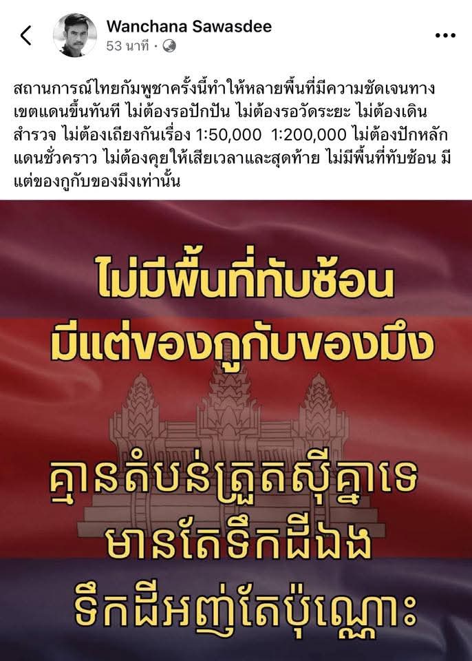 “สถานการณ์ไทยกัมพูชาครั้งนี้ ทำให้หลายพื้นที่มีความชัดเจนทางเขตแดนขึ้นทันที ไม่ต้องรอปักปัน ไม่ต้องรอวัดระยะ ไม่ต้องเดินสำรวจ ไม่ต้องเถียงกันเรื่อง 1:50,000 1:200,000 ไม่ต้องปักหลักแดนชั่วคราว ไม่ต้องคุยให้เสียเวลา และสุดท้าย ไม่มีพื้นที่ทับซ้อน มีแต่ของกูกับของมึงเท่านั้น”
